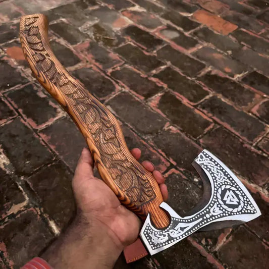 Wrapped in leather and finished with a royal Viking design, it brings ornamental class to battlefield brutality.