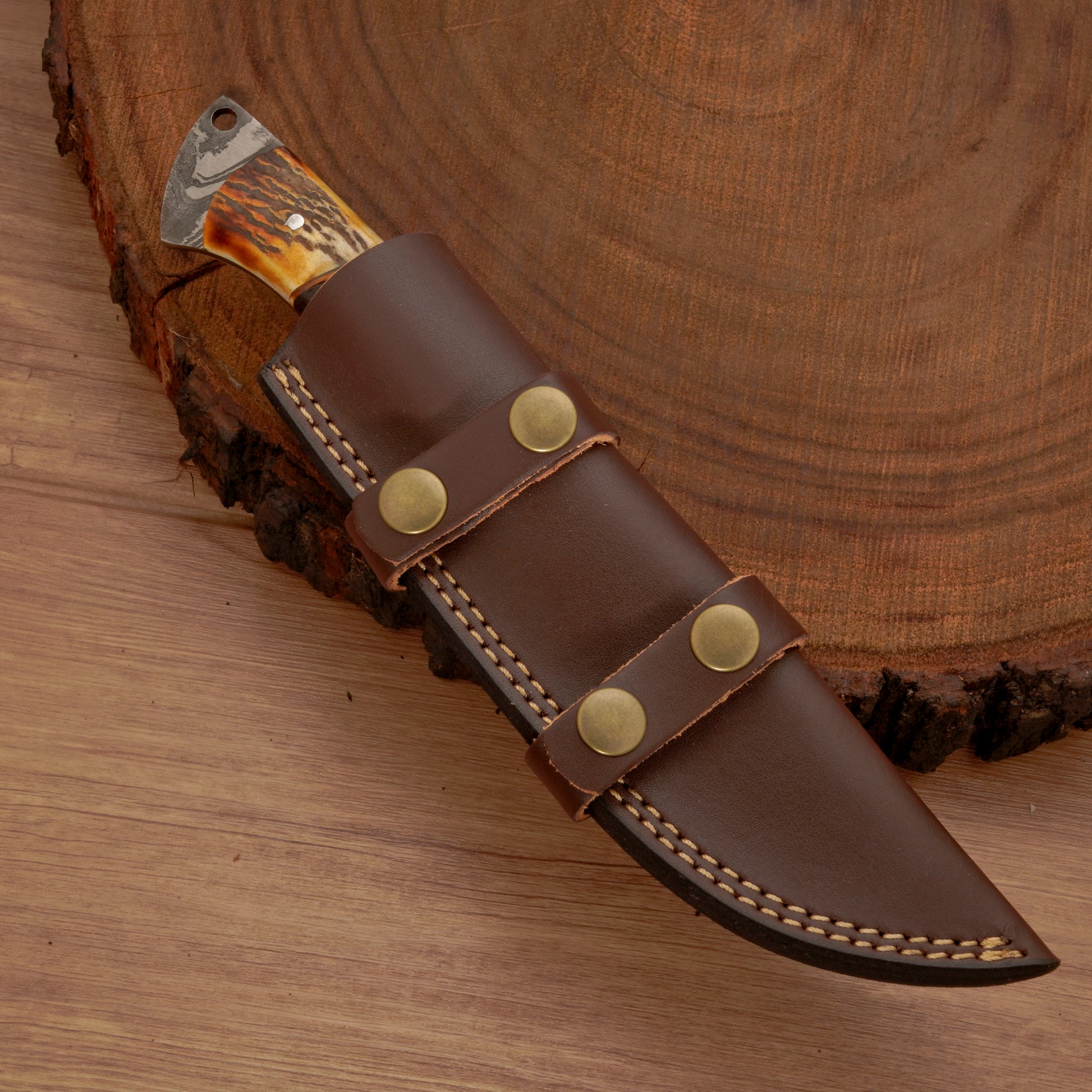 Each aspect of this Skinner knife is crafted by hand, from the Damascus steel blade to the stag horn and rosewood handle, resulting in a knife that's both functional and valuable. Unlike mass-produced Skinner knives, this knife is crafted with ancient skill and high-quality material, giving you an edge to leverage strength, sharpness, and durability.