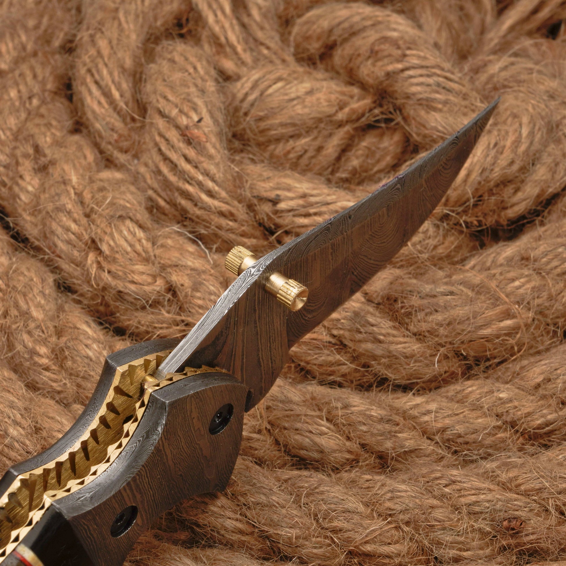 The Damascus Steel Folding Pocket Knife - 7" Handmade Gift Knife with Horn & Pearl Handle - Camping Pocket Knife features a Damascus steel blade forged through a meticulous process of welding multiple layers of steel into a solid block, resulting in a combination of hard and soft steel. This process creates a blade that is not only flexible and tough but also produces invisible serrations that enhance its cutting ability. The unique pattern and texture on the blade are a testament to the craftsmanship involved in its creation.