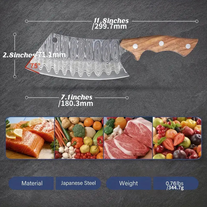 The 7.1-inch-wide blade is made with Damascus steel, giving a stylized cloud pattern. It offers 55–60 HRC hardness for maximum edge life and bone-splitting force. There is a wide and slightly curved cleaver-form blade that makes it perfect for chopping meat, precision cutting, and even vegetable preparation when necessary. You can use it for the kitchen, BBQ, and grilling needs.