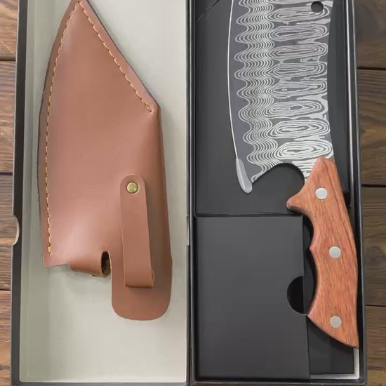 This cleaver features a handcrafted genuine leather sheath that facilitates both vertical and horizontal carry. Whether you are out in the field, sitting around the fire pit, or preparing game on a hunt, the sheath holds your knife safe and at the ready. Its functionality and traditional style are in perfect harmony.