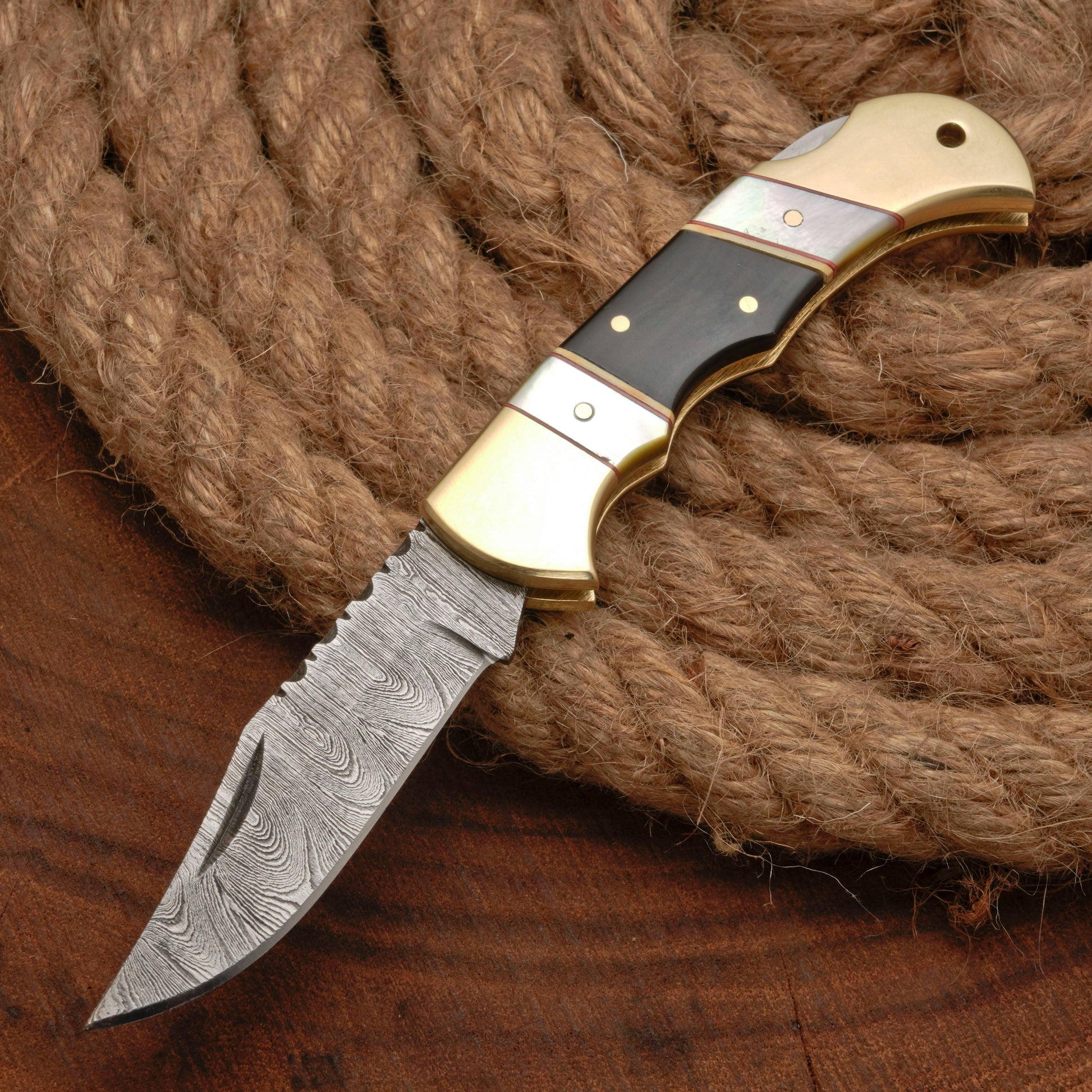 This beautifully hand-forged folding knife features a high-grade Damascus steel blade and a stainless steel framework. The Handmade Damascus Pocket Knife - 6.5'' Back Lock Folding Knife Pearl & Horn Handle - Camping Knife has a horn and pearl handle, secured with brass pins and set into a brass inlay.