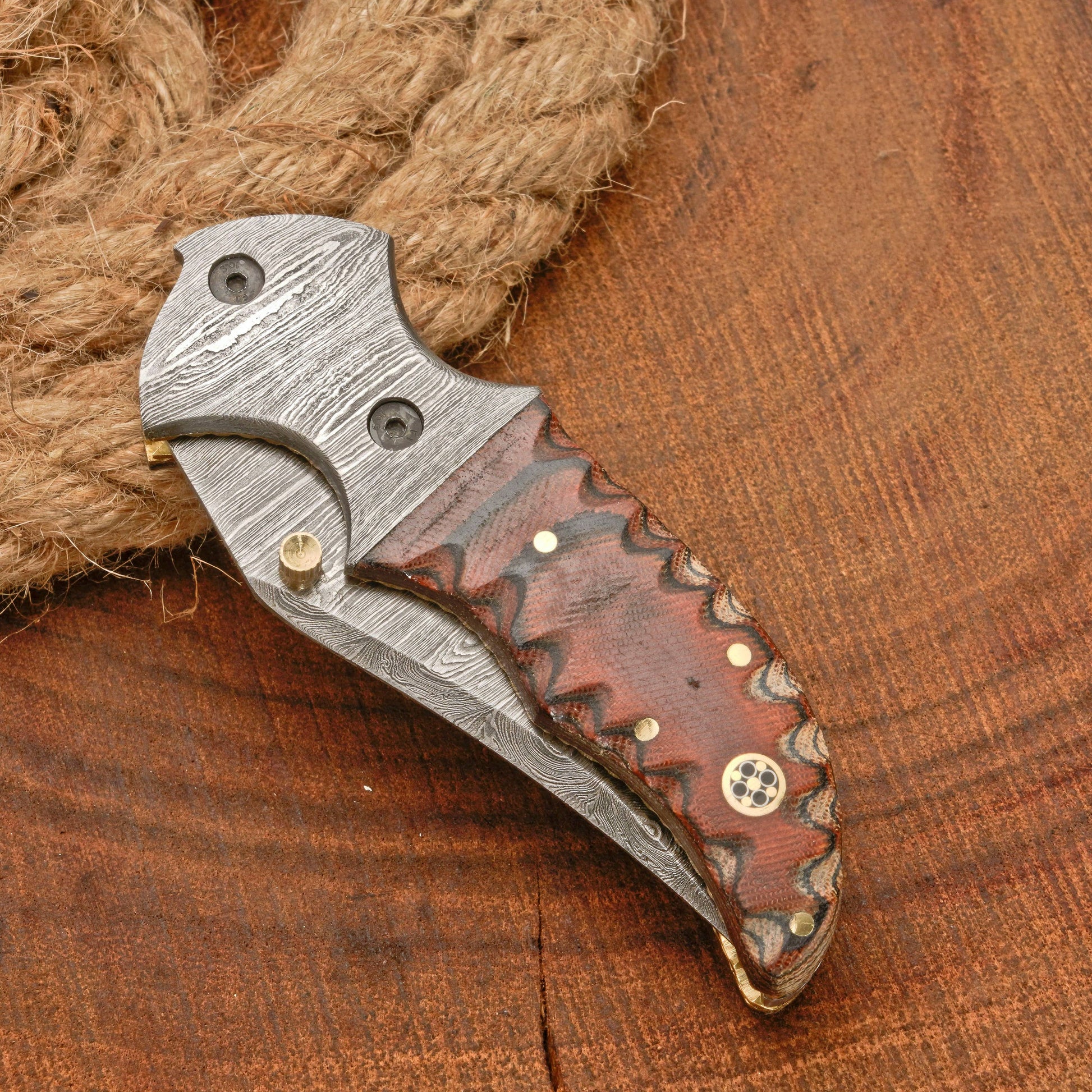 7" Handmade Forged Damascus Pocket Knife with Pocket Clip | Folding Knife - Micarta Handle - Damascus Bolster