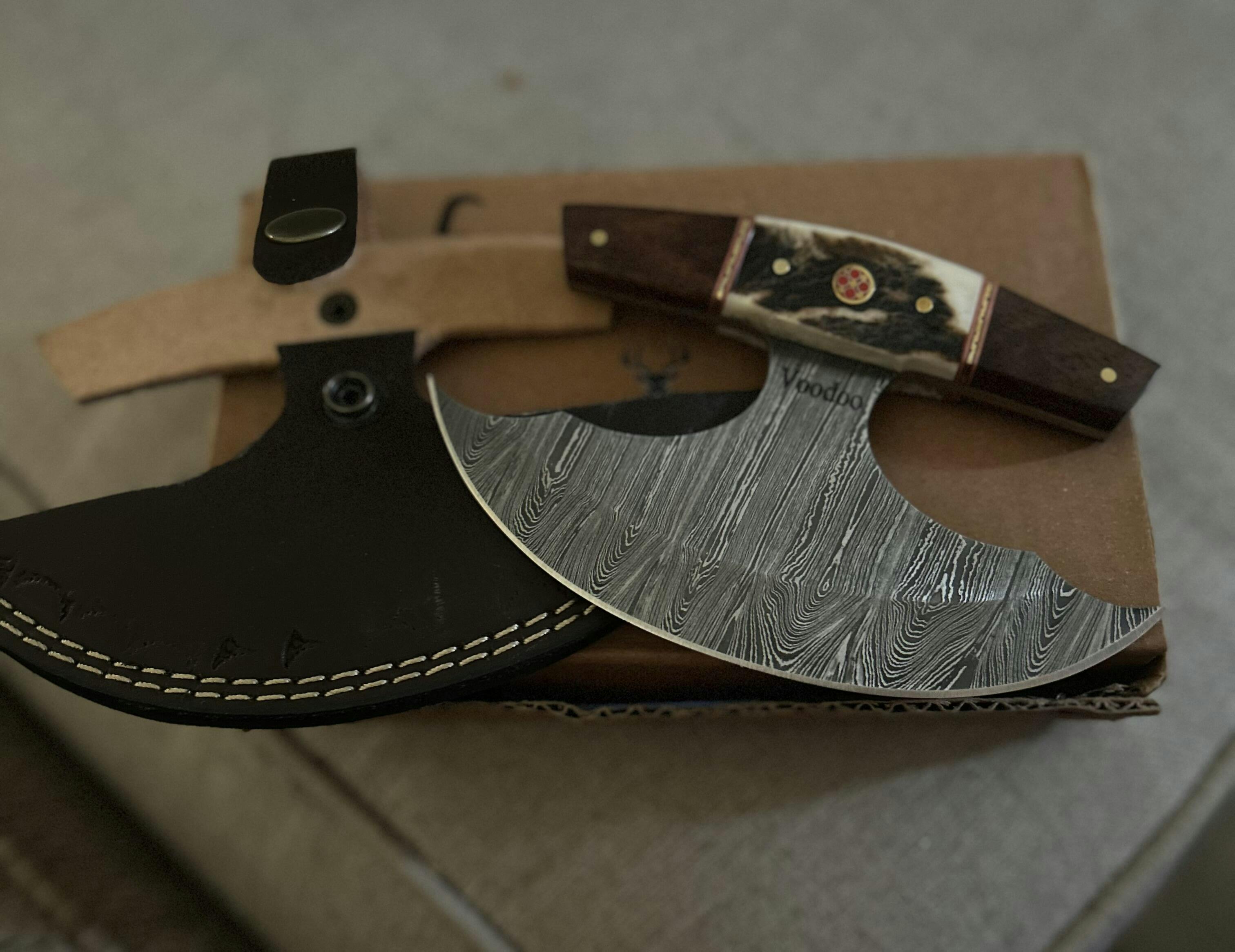 Experience unmatched craftsmanship with our Custom Handmade Forged Damascus Steel Ulu Knife - Alaskan knife . This premier fixed-blade knife features a stunning Damascus steel blade with a unique pattern, offering superior sharpness and durability. The elegant Stag horn handle ensures a comfortable grip, perfect for precision and control. It comes standard with a leather sheath that can be worn vertically or horizontally.